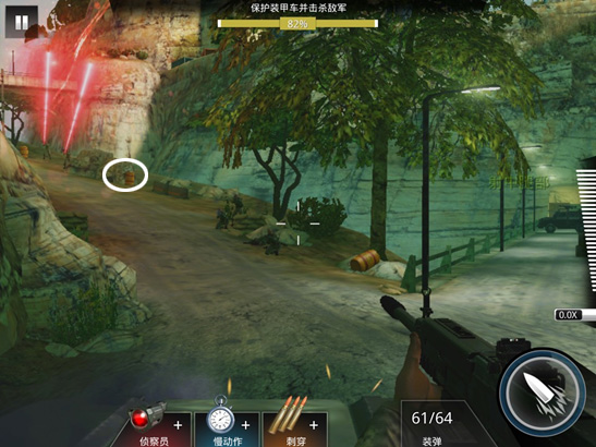 本关任务看似比较简单,但是估计也会有不少人遇到装甲车被炸毁的情况,那么在这个关卡中我们究竟需要注意什么呢? 一定要杀死狙击手!一定要杀死狙击手!一定要杀死狙击手!重要的事情需要强调三遍! 在整个任务中,你会遇到狙击手和步兵。狙击手是本任务必须无一漏杀的关键角色,在遇到后,需要火速击杀,否则他们手中的枪足以让装甲车炸毁,而你的任务也会失败。。而步兵其实更像是打酱油的,但为了保障你不被敌人射杀,还是抽空杀一些为好。 狙击手是很好辨识的,他们在寻找目标时,武器会有红色射线光。另外,如果地图中有油桶,图中画圈的部分,油桶爆炸可以炸死附近的士兵,在后面的其他任务也是如此。(如下图)