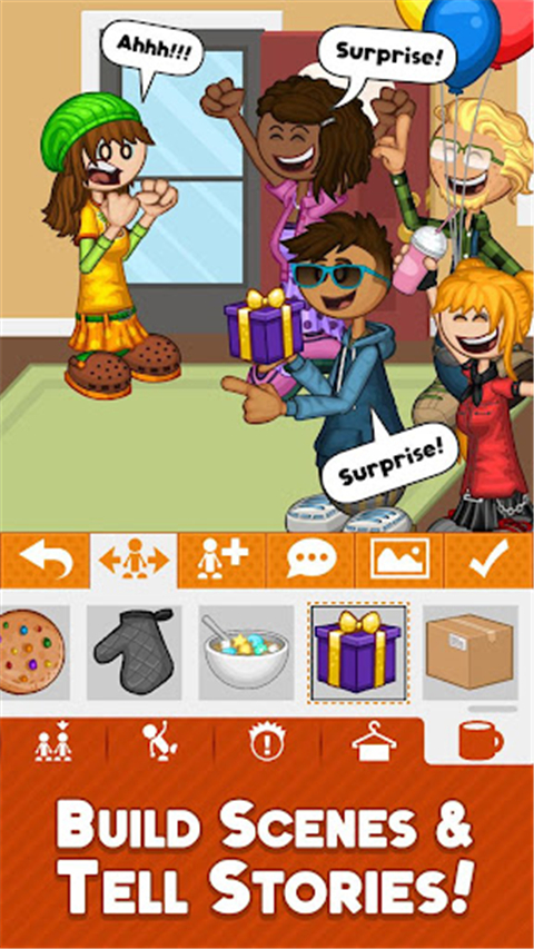 1、创造大量朋友 现在比以往任何时候都更容易设计自己的角色! 使用滑块调整好友的身材,从各种肤色和头发颜色中进行选择,并为好友添加雀斑和妆容等额外细节。 找到适合完美造型的发型,并改变嘴巴和眼睛的样式,赋予它们一些个性。 随时切换到服装部分,为您的朋友选择数百种独特的衬衫、裤子、裙子、夹克、帽子和配饰,并更改每件物品的颜色以打造令人惊叹的服装。 2、构建场景并讲述故事 创建伙伴只是一个开始! 将你的朋友与风景、文字气泡和道具结合起来,安排你自己的自定义场景。 您可以将好友放置在场景中您喜欢的任何位置,并使用手势旋转和调整它们的大小。 从每个角色的各种姿势中进行选择,并改变他们的面部表情以匹配他们的心情。 您可以在场景中使用各种背景来帮助讲述您的故事,还有数十种道具可供您的朋友握在手中。 如果朋友有话要说,还可以在场景中添加单词气泡和标题! 3、添加路易爸爸和他的朋友们 您的朋友正在寻找更多朋友吗? 您还可以包括 Papa Louie 和他来自他的许多餐厅(如 Papa's Freezeria)的著名顾客! 提供多个客户包,其中包括少数客户、大量场景的新背景和道具,以及任何自定义伙伴都可以使用的新服装。 顾客可以使用与您的朋友相同的所有姿势和道具,他们甚至会配备自己独特的替代服装。 4、保存和分享 创建场景后,您可以将图像保存到您的设备,或通过消息或社交媒体与您的朋友分享! 您还可以随时返回并编辑任何已保存的场景和好友。 5、无限可能 将场景图像用于各种内容,例如连环画、模因或视觉同人小说。 展示您的角色设计,为您的朋友创造疯狂的场景,或在多个场景中讲述一个故事。更新日志