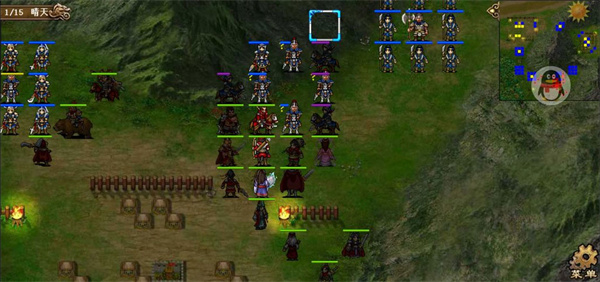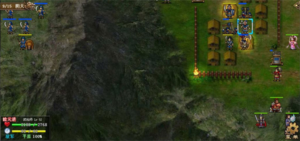第三回合,敌军法师团出击,关羽出现,开局不让关羽上阵,第三回合他强制出来,此时就是玩家操控了,这个关羽是敌军成长敌军配装,能打能抗非常强力,我军阵型收缩