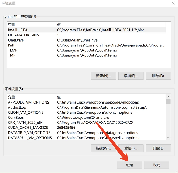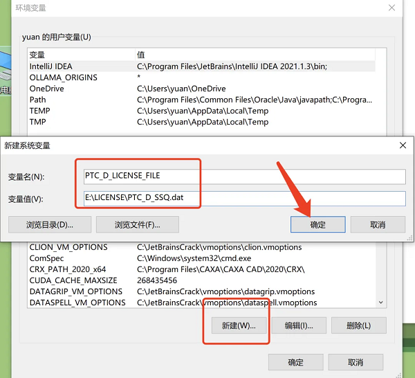 6、点击新建系统变量,在变量名输入【PTC_D_LICENSE_FILE】,变量值输入【E:\LICENSE\PTC_D_SSQ.dat】,然后点击确定。