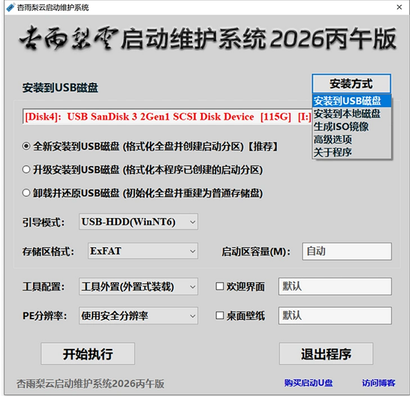 杏雨梨云启动维护系统2026丙午版是一款U盘启动盘制作工具,其界面友好、使用简单,且提供三种安装方式:安装到USB磁盘、安装到本地磁盘和生成iOS镜像,用户还能通过选项选择全新系统安装、升级并安装或卸载并还原。此外,杏雨梨云启动维护系统2026丙午版支持运行多种维护功能,包括Windows PE系统、工具菜单、分区管理、密码清除和系统诊断等,能够全面满足用户的系统维护需求。欢迎有需要的用户前来本站下载使用。