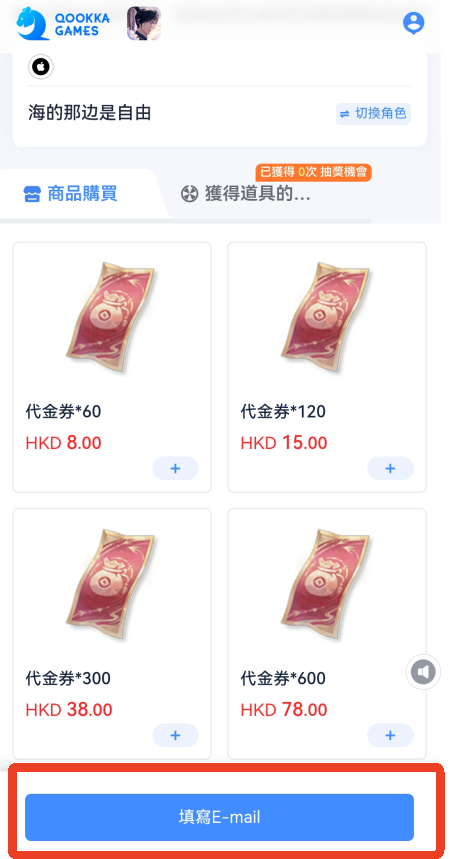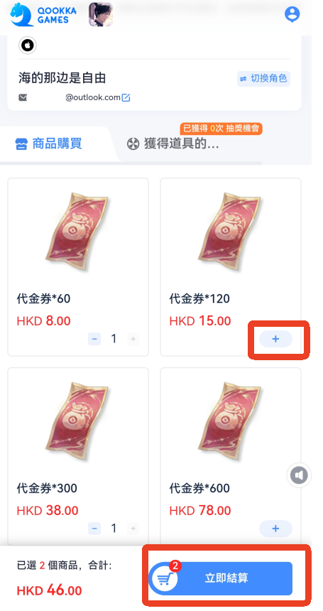 6、绑完邮箱就能开始购买充值商品,点击【+】号加入到购物车,点击右下角。