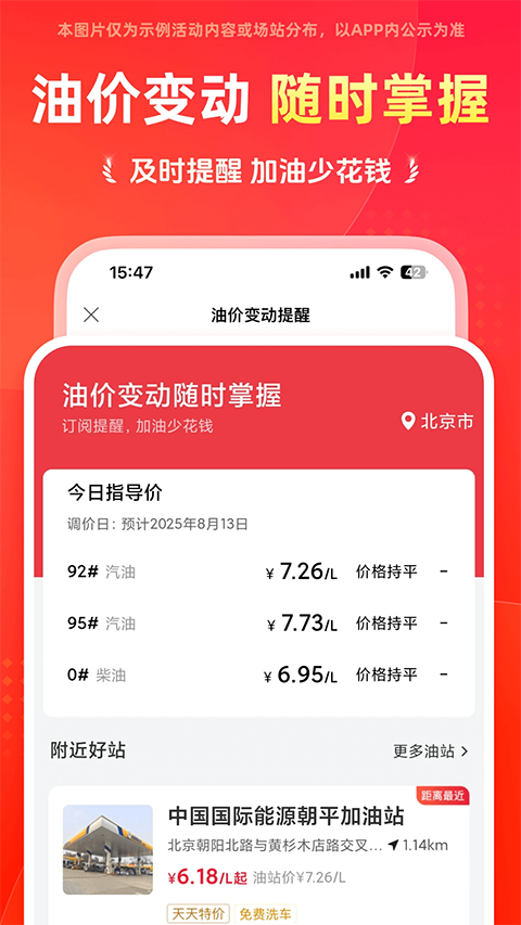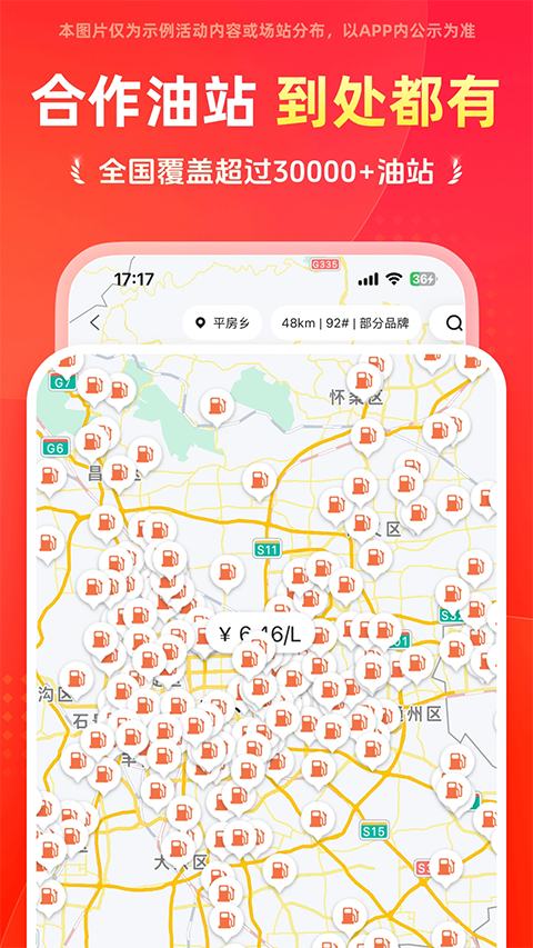 2、系统会自动显示附近的加油站,全面展示加油站的信息,包括油站地址、名称、距离、综合油价对比、优惠信息、促销活动、配套服务等,可以根据需求选择最合适的加油站,也可以选择附近最便宜的加油站。