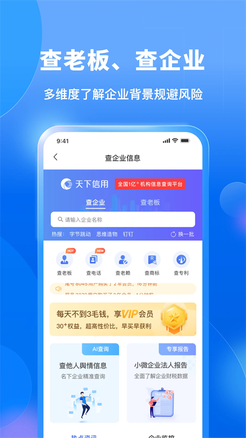 天下信用app是一款查询企业或者个人信用查询的手机软件,有了它用户可以轻松的查询各种信息,清楚的了解自己和企业的信用,现在小编为用户分享一下天下信用正规吗的回答。 1、查企业信用,明风险,智选择 跳槽前了解意向单位怎么样、买房前了解开发商靠不靠谱、理财前综合了解企业信用状况、交易及合作前考察对方单位经营状况等等,上“天下信用”,快速查询企业信用报告,全方位了解企业信用,预防风险。 2、查询自己的信用报告,管理自己的信用 查询自己的信用状况,看看自己有没有贷款逾期、不良的信用记录,以及查询自己的身份有没有被冒用等等,上“天下信用”,一键查询自己的信用状况,管理自己的信用。 天下信用APP上的扫描识别身份证的技术 3、查他人信用,快速了解,提高效率 在相亲、交友、租房等与他人的社会活动时,可以通过“天下信用”向他人发送授权请求,查询对方信用报告,对对方有更全面的了解。 4、定制专属报告,主动授权他人查看,“诚”意十足 在贷款、租房、婚恋和求职时,通过完善个人相关信息后,定制自己专属的个人信用报告,并主动授权他人查询,让对方更加了解自己,降低沟通成本,提升活动效率。 5、授权企业查询自己的信用报告 在信用卡申请、求职应聘、贷款申请时,上“天下信用”,快速授权相关企业查询自己的信用报告,更快获得相关服务。 6、举报失信违约行为,共建诚信社会 在遭遇欠钱不还、学历造假、企业欠薪、合同欺诈等企业或个人的失信违约行为时,上“天下信用”进行举报,让失信者无所遁形。 7、进行信用评价,是好是坏,广而告之 对保姆、月嫂、家教、上门美甲的技师、就职单位、业务往来公司、培训机构等进行真实的信用评价,让天下人更加了解TA。 8、更快速地获取多元化的服务 以征信服务为核心,“天下信用”将引入优质企业提供的贷款、理财、信用卡、消费分期等服务产品,让社会大众“一站式”获取相关服务,更快速地满足自身需求。更新日志