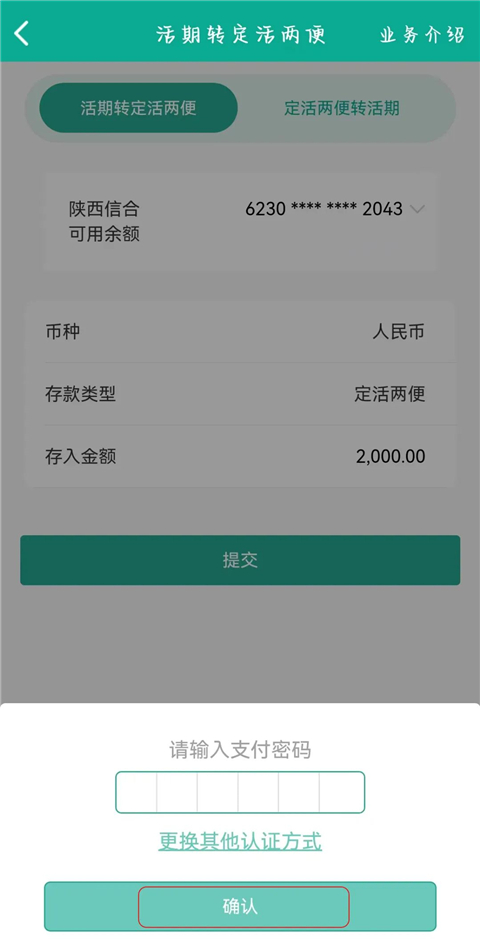 3、输入支付密码,点击确认,密码核验成功后,提示交易成功,即该笔定活两便开户业务办理完成。