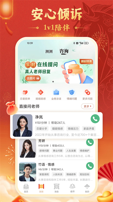 1、【情感咨询树洞】 - 支持文字、语音、视频多种咨询方式;众多专业情感达人1对1在线为你解答恋爱、婚姻、人际关系的困惑。 - 匿名提问倾诉,释放压力,无需尴尬,随时随地获得暖心建议,找到情感出口。 2、【星座运势指南】 - 每日/每周/每月星座指南,了解爱情、事业、财运走向。 - 星座配对分析,分析你与TA的契合度,揭秘缘分深浅,看看你和TA是不是天生一对! 3、【黄历宜忌查询】 - 重要日子一键选吉时,如婚嫁、出行、动土时机,到生肖运程每日解析,再到对传统节气的深度解读,让你知晓天时变化对生活的潜在影响,助力你顺遂生活。 4、【趣味心理测试】 - 专业心理测试:MBTI性格测试、依恋类型测试、职业兴趣测试等…… - 超多好玩测试等你来挑战:内心住着哪种动物、沙雕脑洞题…… - 生成专属的解析报告海报,发现不一样的自己!软件功能