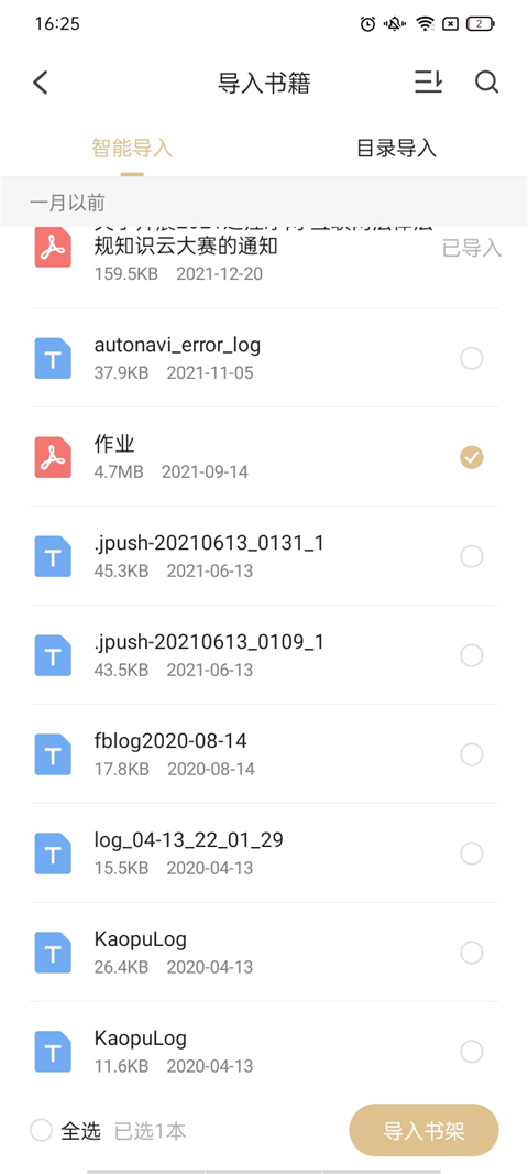 2、这个生活我们就可以选择你下载的书籍,并点击下方的导入书架;