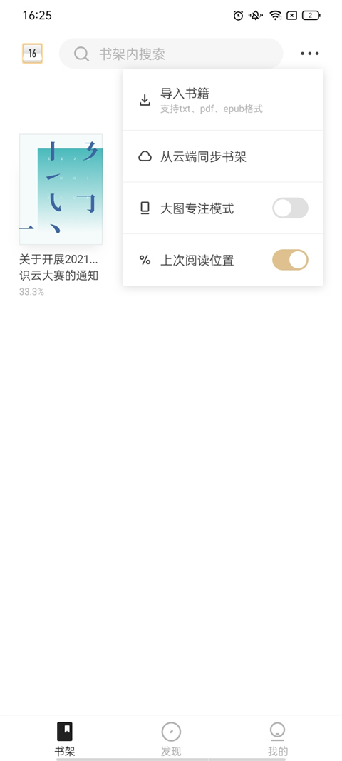 1、点击书架板块,选择右上方的选项图标,并选择导入书籍;