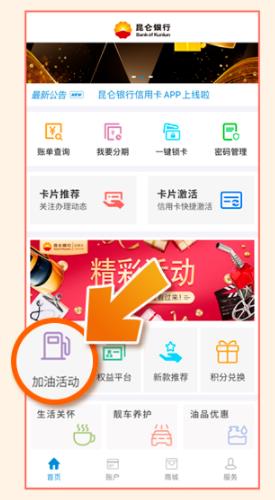 3、昆仑银行信用卡公众号-更多服务-生活服务平台-昆仑YOU享日“加油满200元立减66元”。