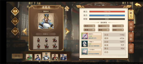 1、战略 三国戏英杰传需要在全国地图上决定向哪座城市增兵,从哪座城市撤退,攻打哪座城市,守备哪座城市,纵横开合,在乎一心 2、战役 在战役场景下,您需要决定派哪位将军上战场,并控制着这位将军的攻击和防守,每局有时间限制,超过时间限制还没有将敌将干掉,您的武将就失败了,如果您的所有部 队都失败了,该场战役您会被判定为输,敌人会俘虏您的武将,夺取您的城池,记得出门打仗时多带些钱粮,给武将们佩戴神兵利器,各个兵种都带些,才更容易获得胜利 3、内政 在内政场景下您可以寻找武将,寻找神兵利器,升迁和降级您的武将,赏赐武将以获取忠心,开发人口,增加城防等三国戏英杰传手机版如何通关蜀汉炼狱虎牢关之战