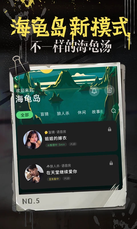 1、【线上轰趴 认识新朋友】 来玩海龟汤,互动猜谜;谁是卧底 ,投票猜卧底 2、【组局玩乐嗨个不停】 和你的朋友一起玩时下流行聚会社交新方式,一起嗨起来 3、【定制个性社交新玩法】 自定社交新玩法,让你成为大家膜拜者 4、【有趣的灵魂多才多艺】 世界很无聊,海龟汤拯救你。 5、【互动新玩法 邂逅心动的Ta】 「语音&聊天」聊天唱歌,各种欢乐不停歇! 「婚礼&小窝」教堂举办婚礼,好友见证爱情,记录每个甜蜜时刻! 「动态&广场」好看的小哥哥小姐姐都在这里,关注兴趣话题分享精彩瞬间!游戏特色