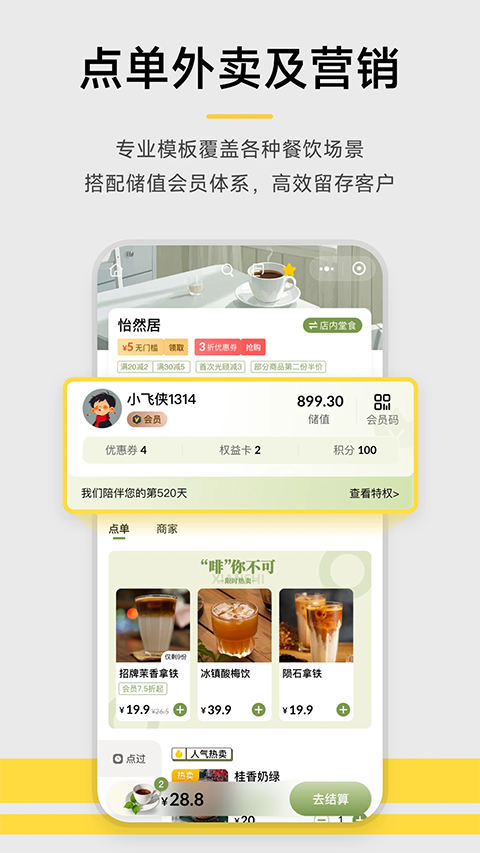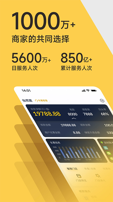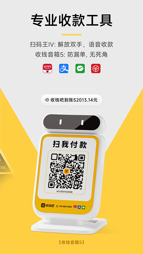 - 900万商家的信赖 覆盖全国680+城市,从夫妻店到国际连锁品牌都在用。 - 全行业一站式解决方案 顾客自助点单、外卖、微信小店、收银系统、会员营销,多款生意工具助您提高营收和效率。 - 1秒极速收款 支持微信、支付宝、银联云闪付、信用卡、花呗等多种支付方式。 - 智能语音播报 笔笔播报金额清晰,到账通知安全省心! - 专属外卖与点单小程序 帮您打通线上线下,轻松接单,生意更高效! - 专业收银设备 扫码王、收钱音箱、收银机,提升店内收款效率。收钱吧常见问题