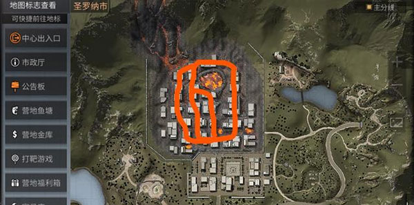1、这个地图最难找的箱子,随机刷新的范围比较广,很需要耐心。刷新在地图中间的被岩浆侵蚀的城市区中的屋顶上,具体是哪些房子的房顶,详见下图。