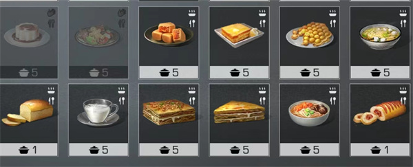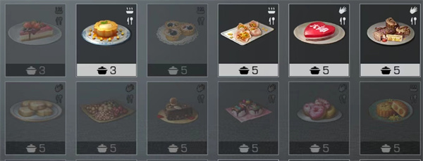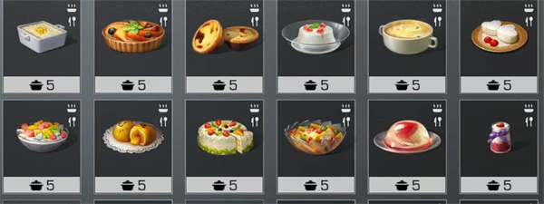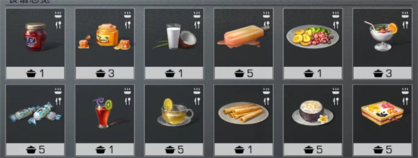 1、果酱:4水果 2、蜜糖:4蜂蜜 3、纯椰汁:4椰子 4、果味棒冰:1水果/3冰块 5、水果蜜饯:2水果/2蜂蜜 6、水果牛奶:2水果/1牛奶/1冰块 7、奶糖:2蜂蜜/2牛奶 8、果汁:2水果/2冰块 9、蜂蜜水:1蜂蜜/3冰块 10、蛋卷:3面粉/1禽蛋 11、椰子冻:2冰块/2椰子 12、椰汁水果捞:3水果/1椰子
