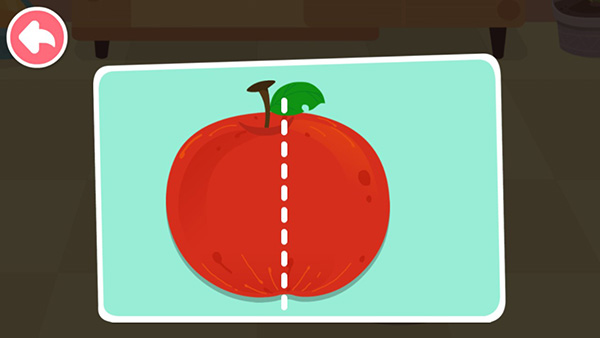 7、带好发卡之后妹妹就可以起床一起玩耍啦!首先开始和妹妹一起分享苹果和饼干,让宝宝将苹果和饼干沿虚线对半分,然后就和妹妹一起吃掉啦!