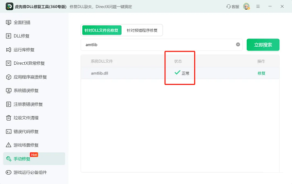一、DLL修复失败怎么办? 方法1:手动修复法 在虎先锋DLL修复软件中,具备【手动修复】功能,找到想要的DLL文件,点击【修复】,即可【修复成功】,这里状态由【缺失】将由变成【正常】。