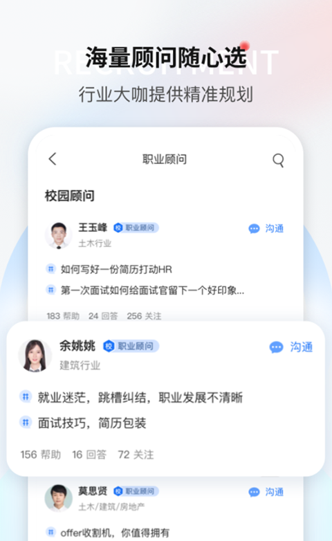 1、行业定制 聚集行业招聘信息,了解行业动态。 2、职位推荐 专业行业细分,精准职位推荐,让你快速找到适合的好工作。 3、即时沟通 与HR实时在线沟通,掌握主动,闪电入职。 4、面试动态 面试通知实时获取,面试动态及时掌握。 5、薪酬查询 找工作怕工资开低了?同行薪资水平,一查便知。 6、投递反馈 随时查看投递进度,实时接收面试邀请。好工作不错过。 7、保密设置 屏蔽企业、简历保密,找工作更安心。 8、职位安全 企业人脸识别和人工审核双重认证,杜绝虚假企业。 9、学习成长 在这里结识同行,加入行业社群,更有问答社区解答你的职业困惑。更新日志