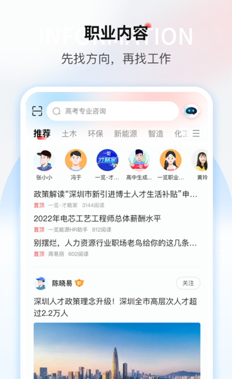 【职业顾问】根据个人困惑选择相匹配的顾问,在线获得个性化指导; 【内容频道】解析职业方向,向你呈现前沿视野与知识; 【行业招聘】聚焦行业细分,汇聚招聘信息,职位高度匹配; 【直播招聘】企业招聘实时直播,在线和boss直聊offer,闪电入职; 【校园招聘】汇聚高校招聘会,让怀才的你校招与伯乐企业相遇; 【即时沟通】与boss实时在线沟通,掌握主动权,让找工作更高效; 【面试动态】面试通知实时获取,面试动态及时掌握; 【投递反馈】随时查看投递进度,实时接收面试邀请,好工作不错过; 【职位推荐】专业行业细分,精准职位推荐,高薪职位为你精准匹配。功能介绍