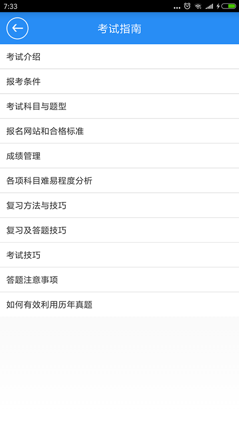 1、章节练习 选择章节,并保留章节练习进度 2、试题收藏 对收藏的题目重点练习 3、考试大纲 详细说明考试的内容和范围 4、历年真题 通过往年的真题,了解考试内容和难度 5、考前押题 主要是列出今年考试概率大的内容,不保证必考。常见问题