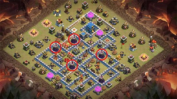 法师塔靠外组成防御链,让蝙蝠的威胁大大降低。大本营用多层城墙包围起来,可以有效分流对方部队,也能起到很好的防御作用。