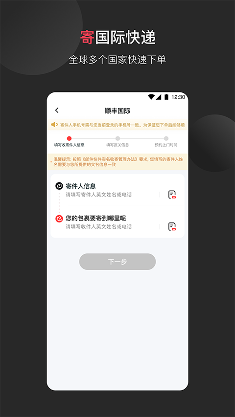 1、根据自身的语言类型使用情况,选择语种就能切换。 2、根据寄件类型即可选择,迅速即可填写信息。 3、点击选择寄件方式,可选择上门寄件,也能选择自寄。 4、输入运单号,立即就能查询到详细的运输进展。 5、极速阅览运单状态,轻松看到每一个运单进度。顺丰国际件收费标准