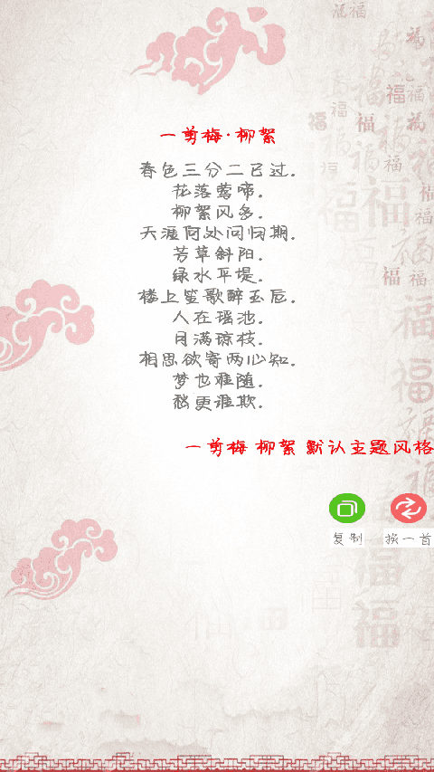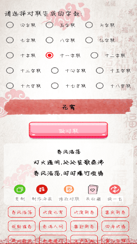 1、智能对联生成 利用先进的算法,根据用户输入的上联智能生成下联和横批,省去了用户繁琐的创作过程,提高了创作效率。 2、多样化创作工具 除了智能对联生成器外,还提供了藏头、藏尾对联、关键字对联等多种创作模式,满足用户不同的创作需求和喜好。 3、藏头诗生成器 不仅支持对联创作,还有藏头诗生成器,让用户可以轻松创作出富有韵味的藏头诗,尽情展现自己的文学才华。 4、丰富的素材库 收录了几千条经典对联和上万条祝福语,为用户提供了丰富的创作素材,让创作更加丰富多彩。应用功能