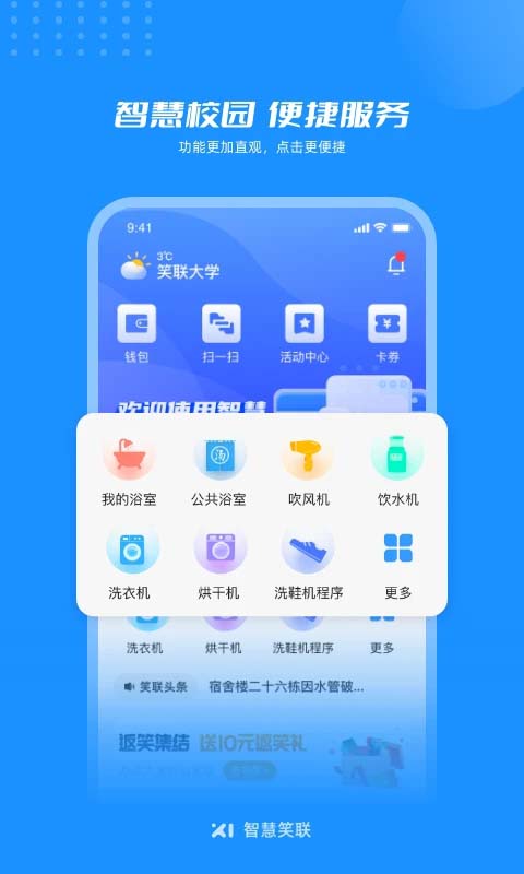 1、娱乐社交 社团活动、广场群聊、游戏伙伴; 2、智能设备 热水器、吹风机、饮水机、空调; 3、商家服务 外卖、快递、广告、招聘、培训;智慧笑联app使用指南