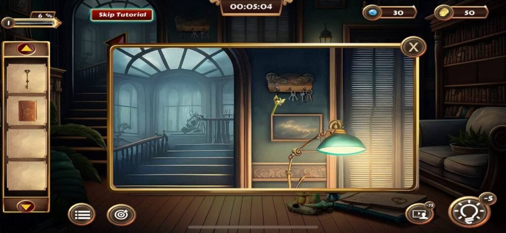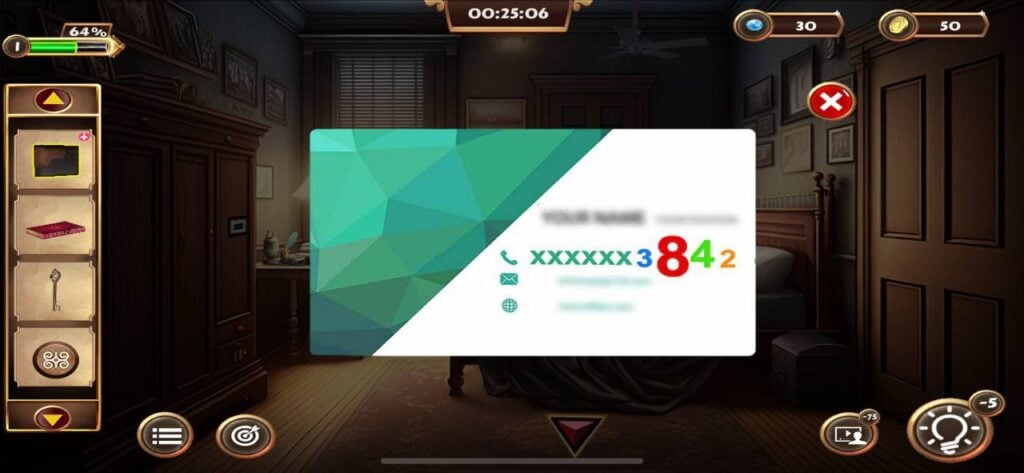 一旦你找到秘密钥匙,点击并拾取右侧门旁架子上的小盒子。通过物品栏菜单打开这个盒子,然后输入4位密码“4825”。