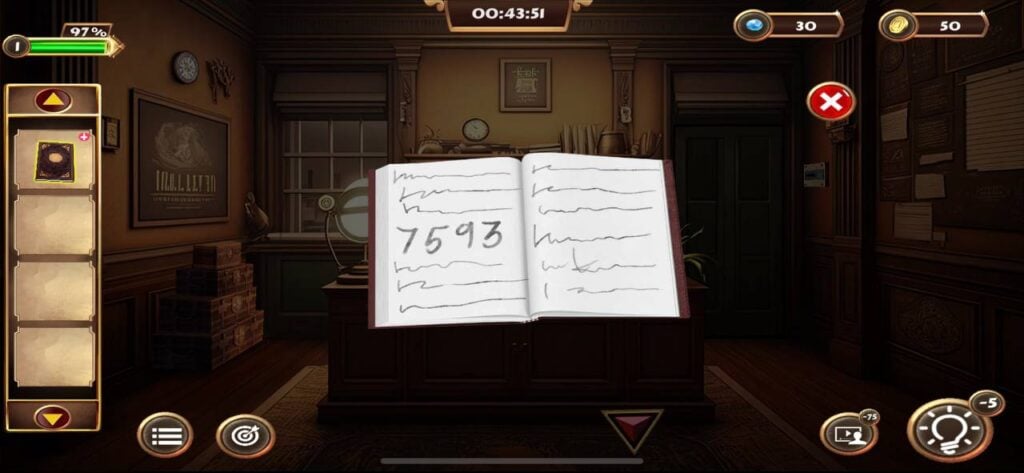 点击面板内的书籍即可旋转面板,露出隐藏在后面的书籍。收集隐藏的书籍并打开,即可看到秘密代码“7593”。