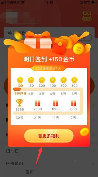 1、打开我的页面上方的签到领奖; 2、在弹出签到小框里点击领更多福利;