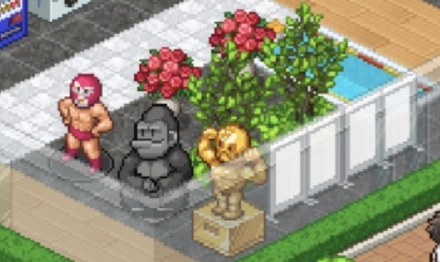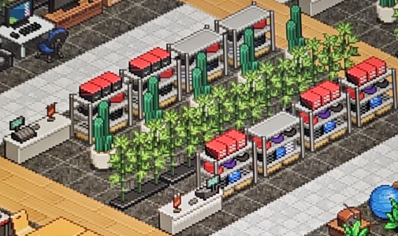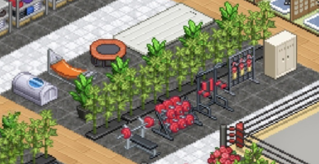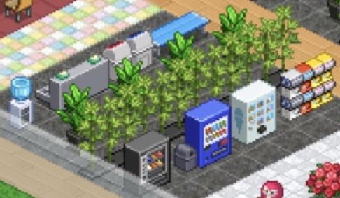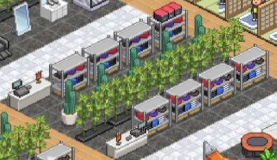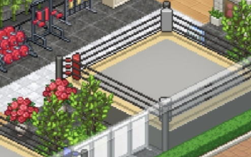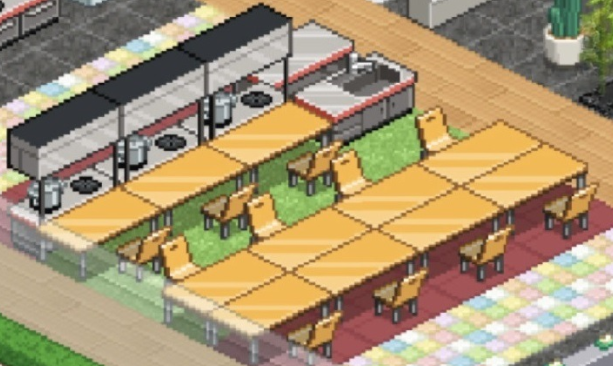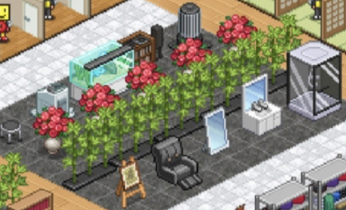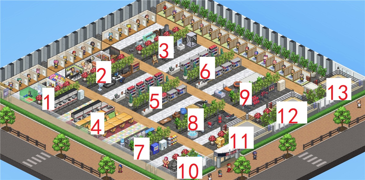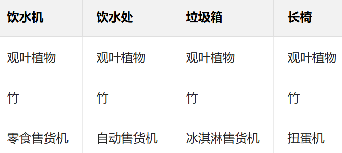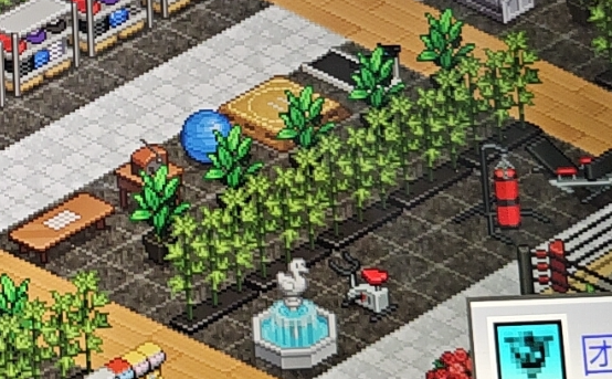 2、上方两侧最外围用柱子隔开,左边放一排西式房间,按照图片所示留两个空位,角落放一个温泉。右边放一排大琴叶榕,再放一排日式房间,日式房间比大琴叶榕少一个。