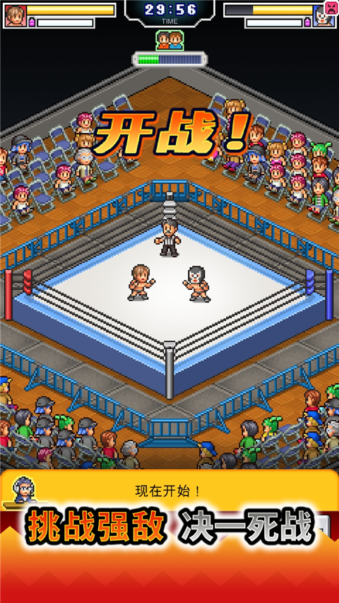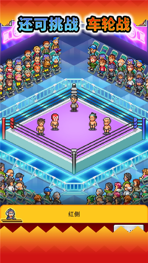 1、全新的职业摔角团体已创立。职业摔角手最注重日常饮食与训练。 在训练场放置卧推器等训练器具,用来锻炼肌肉力量。 不断强身健体,抗衡对手! 2、其他团体的选手正在等待你的挑战!!做好万全准备,开启挑战吧。 在赛前采访中挑衅、迷惑对手…… 3、接招再接招,忍住伤痛站起来!这就是职业摔角手的魅力。 比赛中战况激烈,全场沸腾。 使出终结技,倒数三个数结束比赛。 4、团体人气不断提高,粉丝们也会来训练场参观学习。 不断增加训练场设备,制作销售产品,快乐如此简单。 5、不断增加己方选手也非常重要。游说兼具实力与魅力的强大选手来加入吧。 还可参加车轮战、6人车轮战。 6、来吧,推动职业摔角行业发展,打造人气职业摔角团体!! 7、还支持触摸滚动和缩放功能。游戏截图