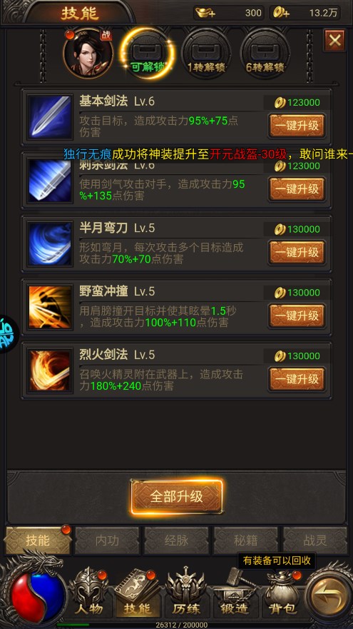 1、技能界面中包括 人物职业技能、内功、经脉、秘籍、战灵五个玩法; 2、技能玩法介绍 每个职业都是有5个技能,达到相应等级后激活; 3、内功玩法介绍 这个技能是一个被动句属性加成技能,激活后有内功值,内功值有的情况下可以抵消当前受到伤害的20%,内功等级提升内功值也就越多,抵消的伤害百分比也会增加。 4、友情提示 内供系统提升金币消耗较高,建议先升级人物技能,等级固定后升级内功! 5、经脉系统介绍 人物等级35级开启,每次消耗10个经脉丹,道具可通过BOSS、关卡奖励、日常副本产出,也可直接从游戏商城购买;