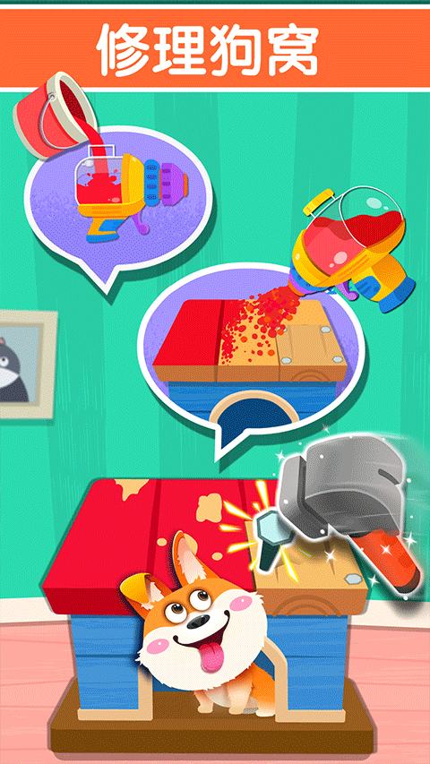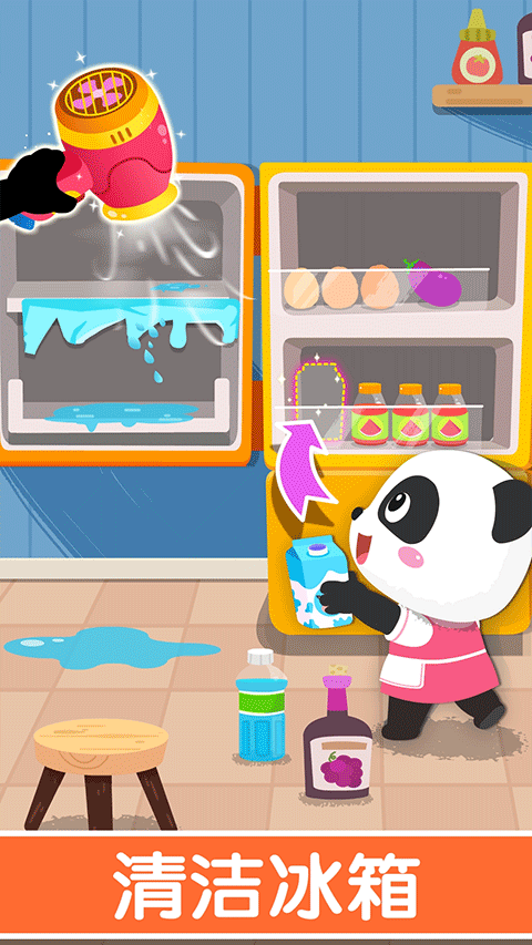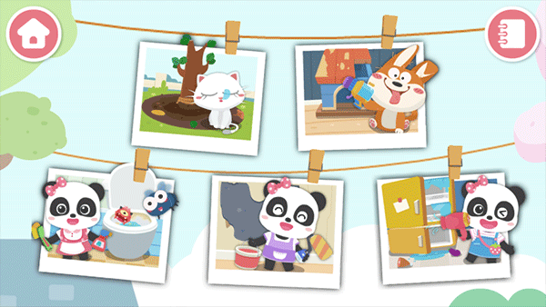 【整理花园】 先来帮妙妙整理花园吧!拔草,松土,种树苗,再帮草莓苗捉虫,然后清理坏掉的叶子,撒上肥料,很快就能坐在树荫下乘凉吃草莓啦!(培养热爱劳动的观念) 【旧物翻新】 小狗的房子坏了,快帮他修好房顶,再刷上漂亮的油漆,小狗看见好开心;清理破掉的墙纸,挑一张粉红墙纸贴上,家里变得好温馨!(激发宝宝创造力) 厨房榨汁机,齿轮坏掉啦,安装正确的新齿轮,再涂上润滑油,问题解决!(形状匹配,锻炼观察力) 【室内清洁】 卫生间里好脏,快来打扫一下!清理讨厌的小虫子,再给马桶喷上清洁剂和杀菌药水,刷完一按冲水建——咦,水下不去?原来是水管坏了,宝宝快来接好它!(锻炼宝宝脑力) 冰箱里结满了冰,不能放食物了。清理冰块,把水擦干,再把饮料,肉类,蔬菜等分类整理好!(锻炼宝宝归类整理的能力) 宝宝,你家务干得真棒!妙妙送了你一枚小勋章!宝宝巴士家园清洁游戏怎么玩?