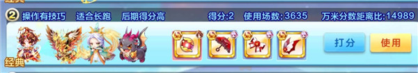 1、第一种宝物搭配方式:妙法红绦,草莓甜筒,碧蓝之音,冬雪猫猫。这套搭配主要使用第一个宝物的满级属性飞天玄女来跑出高分。