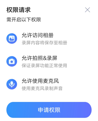 2、点击中间的【开始录制】,需要同意一些权限,点击【申请权限】。