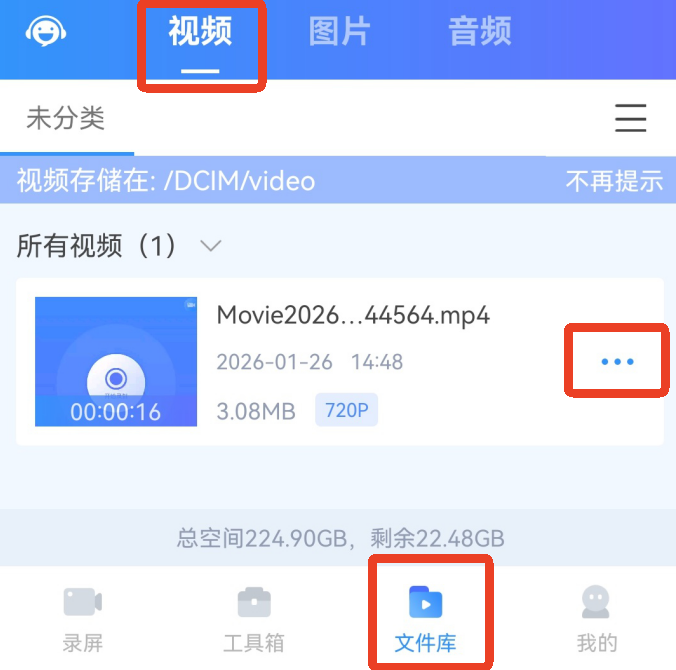 1、来到【文件库】的【视频】页面,点击视频文件右边的三个点。