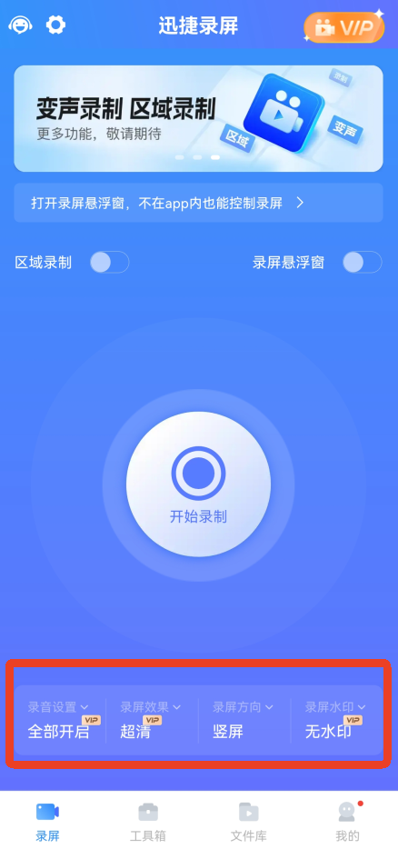 1、打开迅捷录屏大师手机版App后,先设置下方的录音设置、录屏效果、录屏方向和录屏水印。