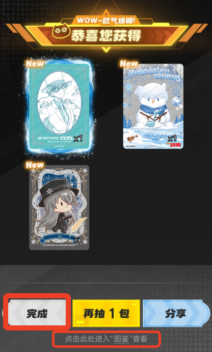 3、拆开之后你可以点击【完成】手动回到图鉴页面,或者直接点击下方跳转。