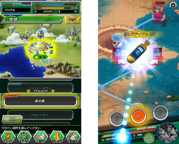 在战斗场面中,玩家必须快速点击画面内的「气」来进行充满速度感的战斗。还能够使出仿佛要破坏画面般的超魄力必杀技,给予对手极大的损伤。让《七龙珠》里的角色们进行修业、觉醒,就能够组成自己的最强队伍。