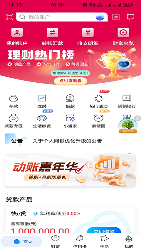 1、快捷菜单任意添加管理服务板块,使用更加便捷。 2、提供众多优质理财服务,为你更好进行金融管理。 3、周边网点快速查询,给您的生活带来更多便捷。 4、银行利率、汇率等信息一键查询,清楚明细。更新日志