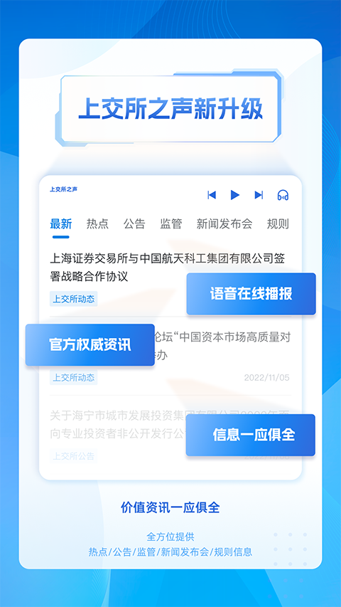 1、获取权威资讯 及时更新各大上市公司、股票、基金和债券公告。 2、掌握市场动态 方便查阅每日证券信息,不再错过重要消息。 3、了解最新业务 纵览全局,将时下最新业务一网打尽。 4、更新实时数据 最先知道最权威的市场统计数据。上海证券交易所手机app使用教程