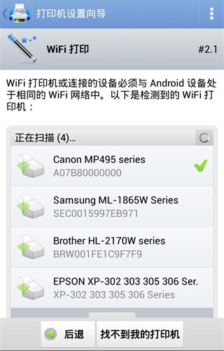 6、选择打印机类型,附近的WiFi打印机、附近的WiFi扫描仪、附近的蓝牙打印机中任意一种,这里我们选择WiFi打印机,软件将自动扫描周边的WiFi打印机,点击即可连接到打印机。