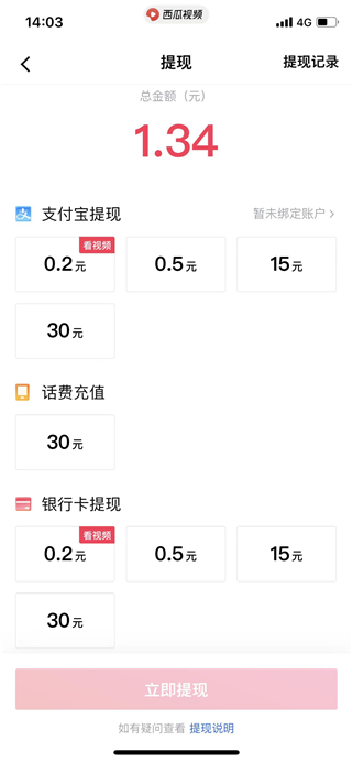4、选择金额进行提现即可;