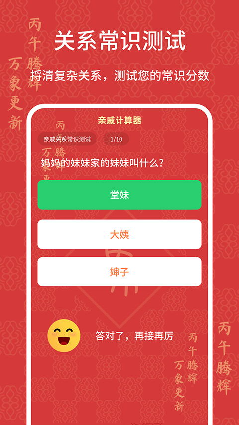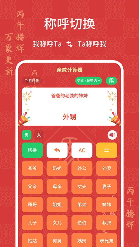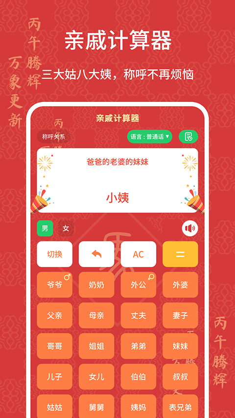 过节时如何称呼一屋子的三姑六婆,七大姑八大姨? 讨红包、收利是时支支吾吾不知道该如何称呼对方说谢谢? 今年刚结婚,老公的姐姐的丈夫的爸妈应该怎么叫? 国家二胎政策开放,大姨妈家里新添的小成员,我该怎么叫? 家族聚餐时,一屋子人混乱的关系让你无所适从? 姨妈or姑妈,表哥or堂哥?表叔伯是什么鬼?复杂的亲成关系理不清? 亲戚计算器帮你解决所有称呼问题,妈妈再也不用担心我不敢开口叫人了! 轻松输入关系,马上得到对方称呼,真正的称呼神器! 支持语音播报功能,针对普通话不好的友友特别附加的哟! 举个例子:我母亲的姐姐的母亲的妹妹的儿子的姐姐叫什么?表姨妈, so easy!功能介绍