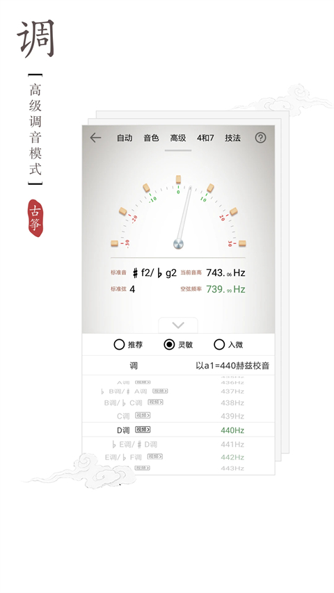1、古筝调音器功能 支持听音模式、自动定弦、高级校音、4 和 7 调音、调音色、十二平均律及古筝技法调音,满足不同演奏与练习场景下的古筝调音需求。 2、古筝技法调音 针对摇指、颤音、泛音等常用技法进行专项调音优化,让古筝校音更加贴近真实演奏状态。 3、节拍器 内置多种专业节拍器音源,辅助古筝练习节奏与稳定性,是古筝学习过程中不可或缺的工具。 4、古筝教学视频 由中国广播民族乐团著名古筝演奏家、金钟奖评委 孙欣 亲自示范录制,配合古筝调音与定弦讲解,帮助用户更高效地完成古筝学习与练习。软件优势