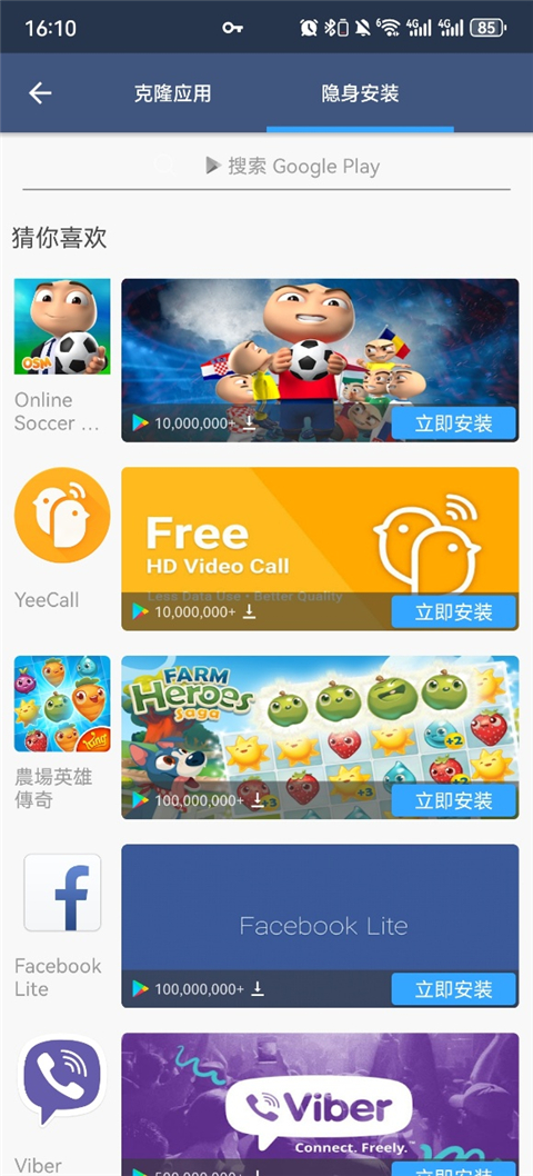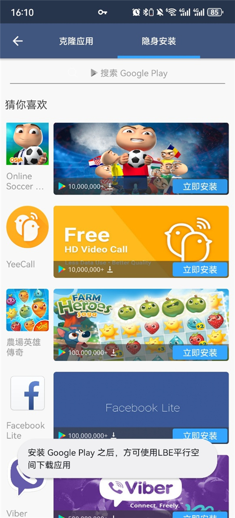 3、如果用户设备中没有Google Play点击进行下载后,即可开启隐身安装。