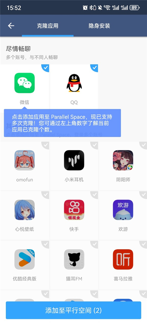 1、一台设备登录多个账户 • 保持个人帐户和工作帐户的分离。 • 探索不同的游戏路径并同时升级多个帐户。 • 保持每个帐户的数据独立且井井有条。 2、使用隐藏的应用程序保护您的隐私 • 保护您私人空间中的敏感应用程序,使其免受窥探。 • 通过安全锁定功能增强隐私性。 3、轻松切换账户 • 同时运行多个帐户,只需轻轻一按即可无缝切换。平行空间App怎么双开应用