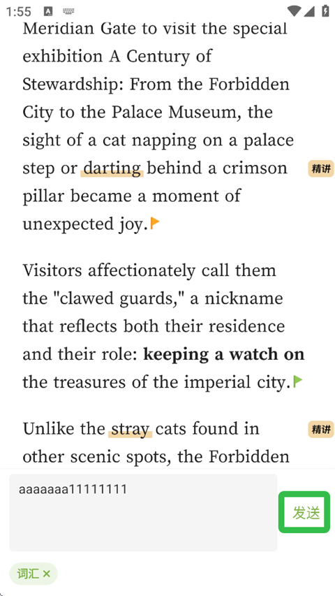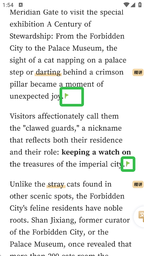 1、对于每篇文章,都会高亮各个等级(例如四六级,雅思,托福等)所要求的词汇,帮助你留心有用的词。 2、所有的生词跟词组或者短语,即点即查。 3、每篇文章中的生词或短语都可以即时添加到自己的学习计划中,利用扇贝网站或者扇贝单词客户端强大的记忆系统进行学习。 4、特别的,扇贝新闻可以记录你每天的学习进度,包括完成的文章数,被激活的单词数,将你日积月累的进步通过图表生动的展示。更新日志