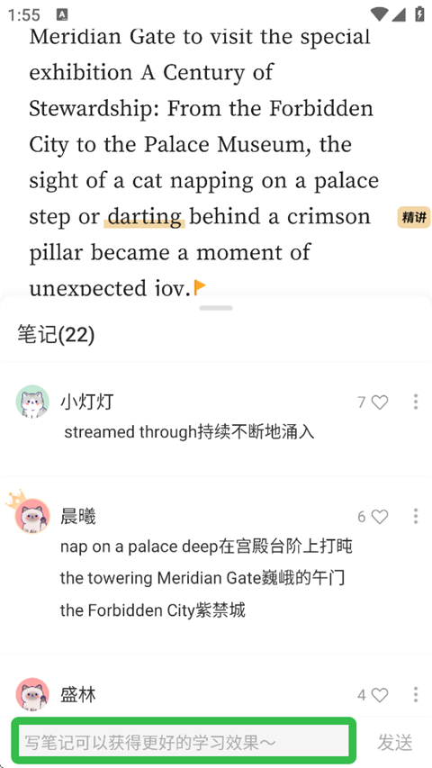 【英文原著】 经典的英文原著,带你感受原汁原味的阅读体验。 【精选短文】 精心编排的英语短文,让你在轻松的阅读中收获学习和成长。 【学习计划】 阅读中的生词可以即时添加到自己的学习计划中,利用扇贝强大的记忆系统进行学习。 【重难点强化】 文章的重点单词、各类考试(四六级、考研、托福GRE雅思等)的难点单词,都会由系统高亮展示,帮助你查缺补漏。 【图表反馈】 你每天的学习进度,都会通过图表生动展示,包括每日的单词和短文数。 【短文计划】 我们还会协助你制定短文计划,约束自己在一个月、两个月内一天不落地进行阅读。 【读书笔记】 你可以在短文中自由添加读书笔记,你的优质读书笔记还会获得其他用户的点赞;阅读完一篇文章,在读后感区可以发布自己的评论,交流学习心得。扇贝阅读app怎么做笔记